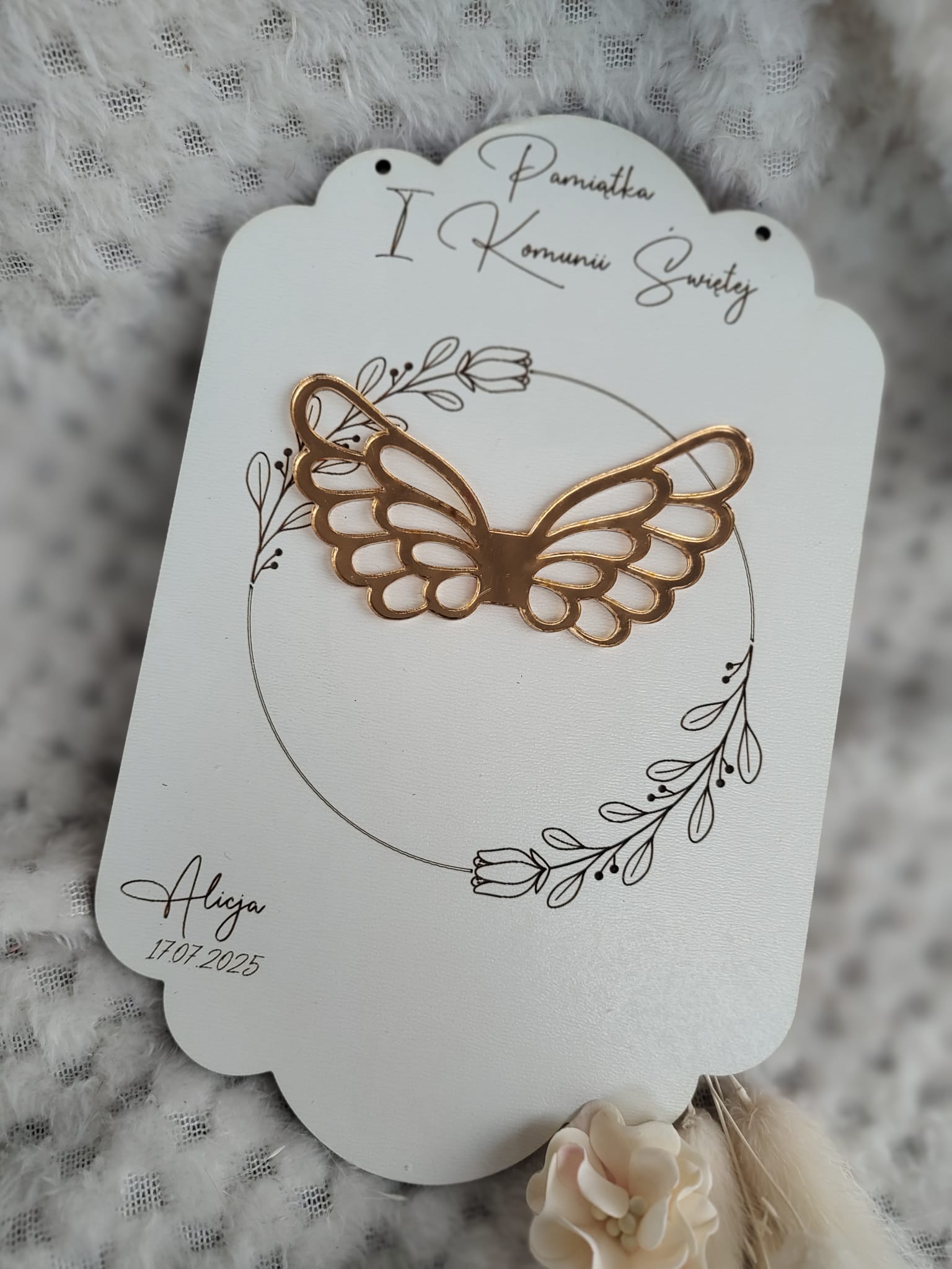 Pamiątka na I Komunię Świętą z HDF 19cm x 12cm 35 znaków H441