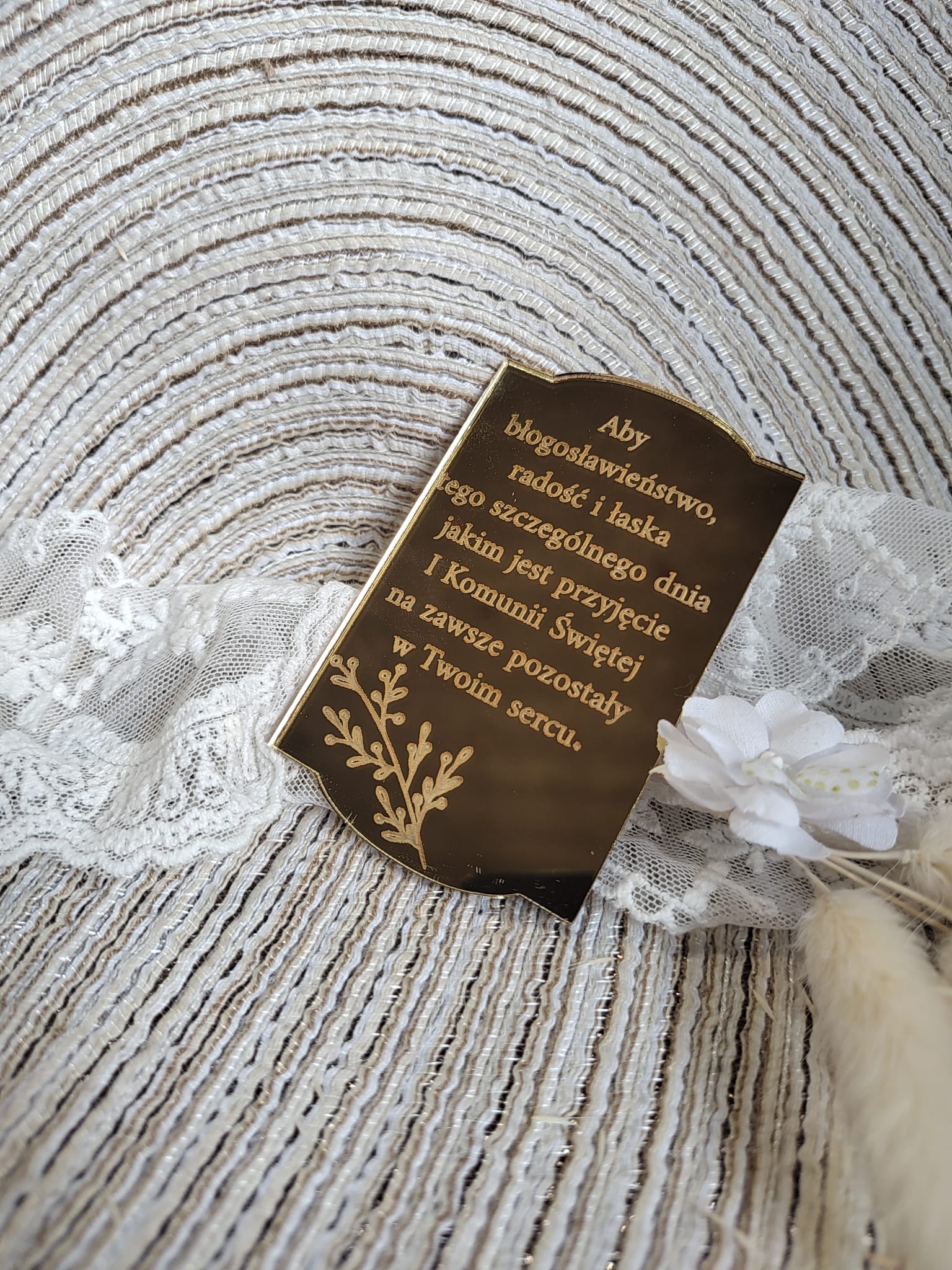 Tabliczka ze złotej plexi do aniołka z makramy