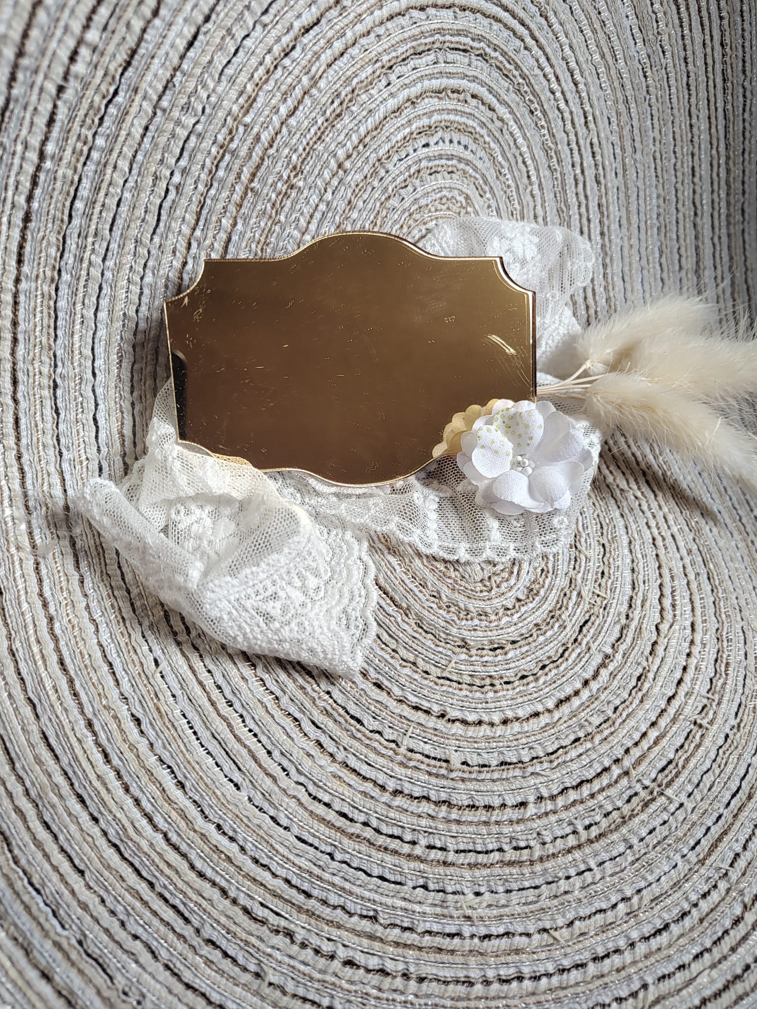 Tabliczka ze złotej plexi do aniołka z makramy
